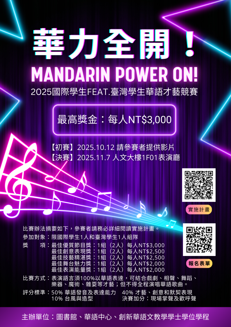◆比賽方式:請設計一場表演,語言須100%以華語表達,表演形式可結合戲劇、相聲、舞蹈、樂器、魔術、雜耍或其他才藝;但不得全程演唱華語歌曲。國際學生之表現應占二分之一以上。
