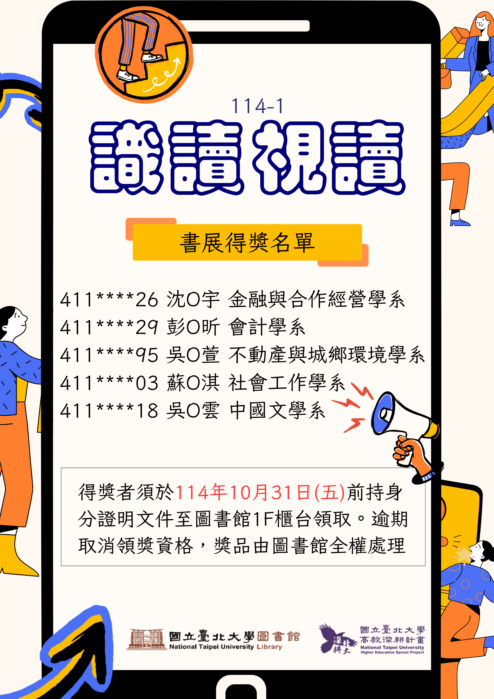 得獎者須於114年10月31日(五)前持身分證明文件至圖書館1F櫃台領取。