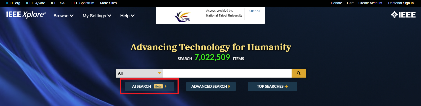 於校園 IP 範圍內連線至 IEEE Xplore,從 IEEE Xplore 首頁點選「AI Search Beta」即可使用。同時上線人數至多 10 人。使用手冊請參考附件。