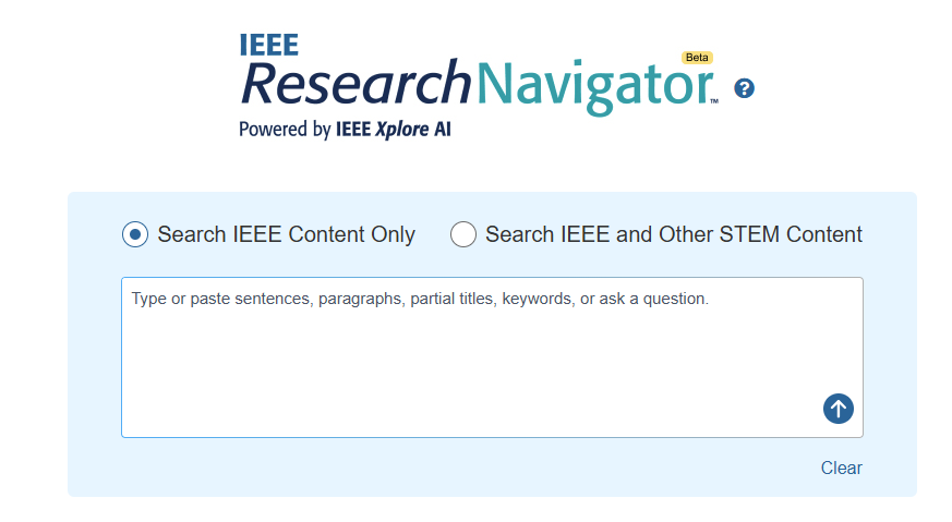 - Research Navigator: 進階查詢工具,集中檢索 IEEE 與其他 STEM 相關研究領域出版者的期刊文章及會議論文,並提供智慧關鍵字建議,幫助使用者快速優化搜尋字詞。